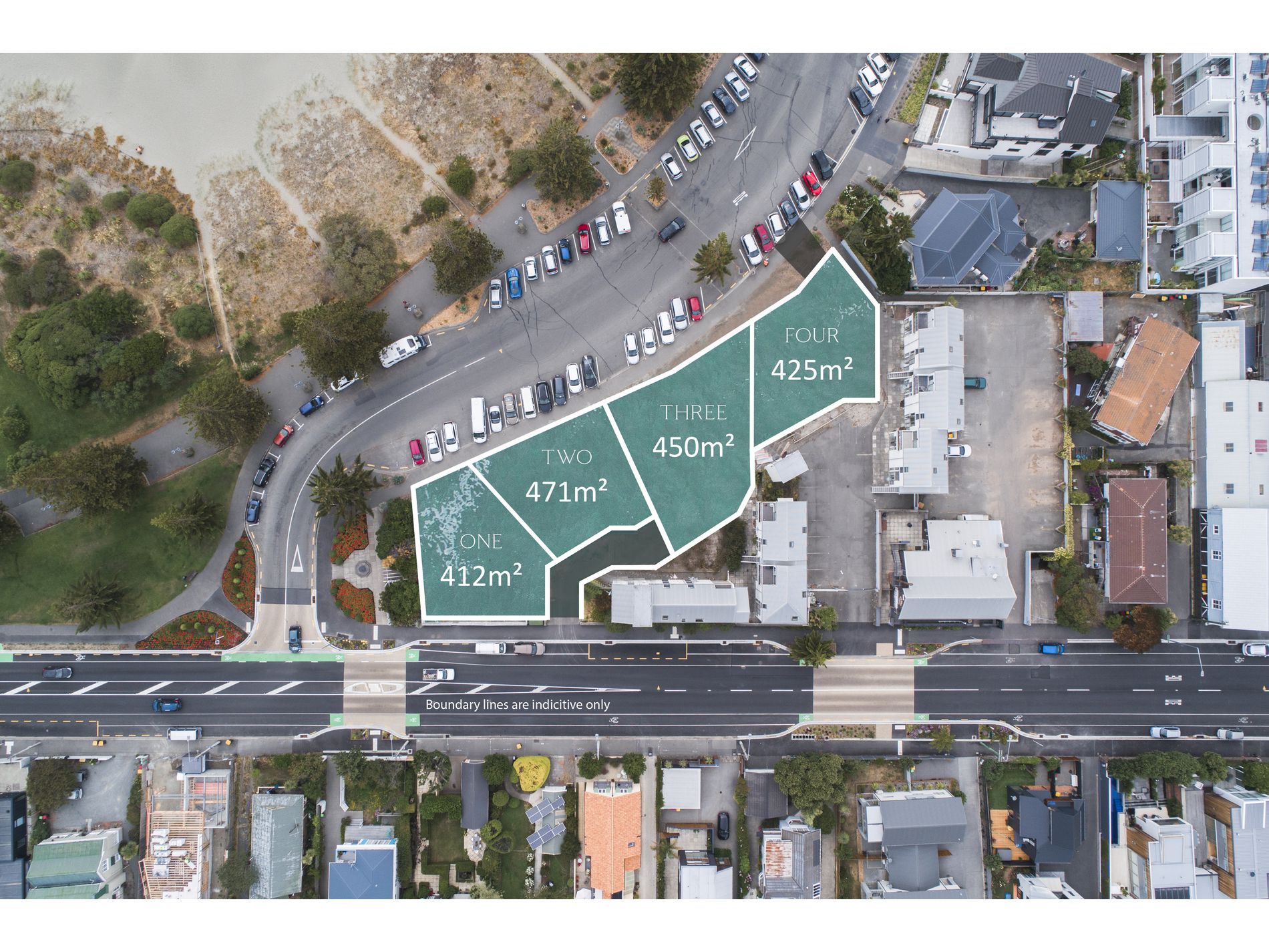 The four sites are between 412m2 - 471m2 with a total of 1,758 m2 and in size plus a planned private right of way off Marriner St accessing lots 1-3. Lot 4, which occupies the western corner of the property, will have private vehicle access from the Esplanade. The lots are being sold individually or together.