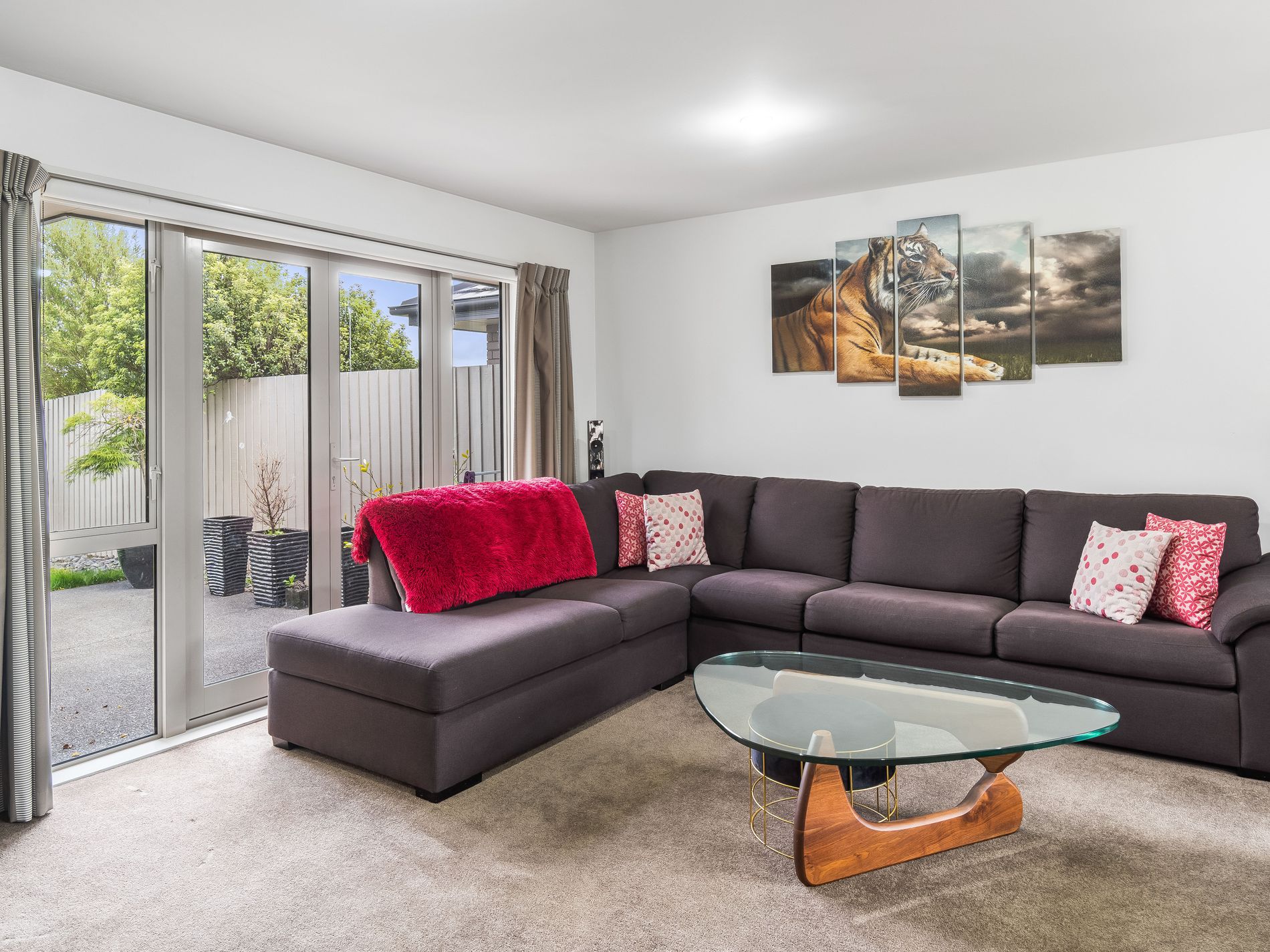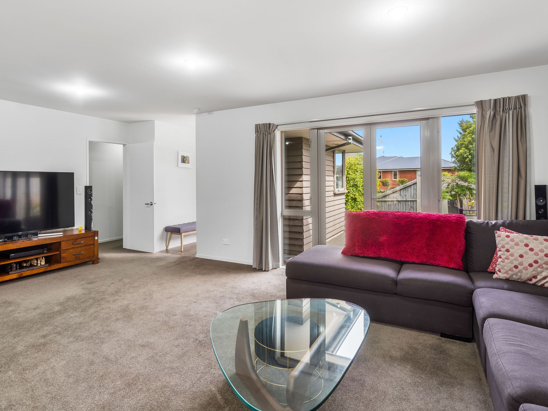 The open-plan lounge and dining room share a north-facing aspect with the adjoining modern kitchen. Through the hallway are three spacious double bedrooms, the master graced with a well-designed en-suite featuring a cavity closing door, and internal access from the front-facing double garage.